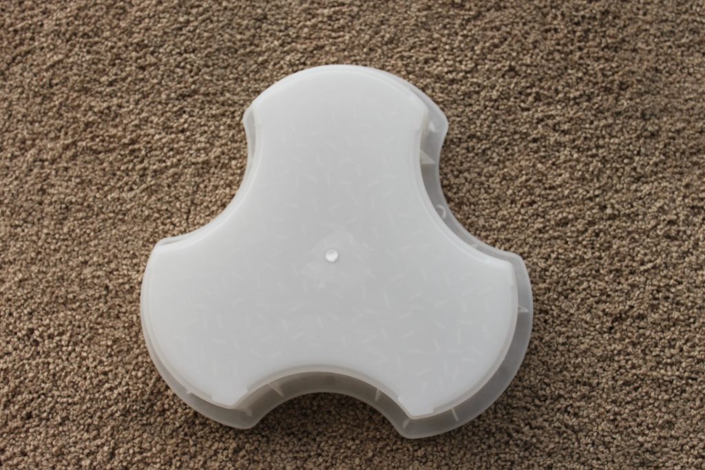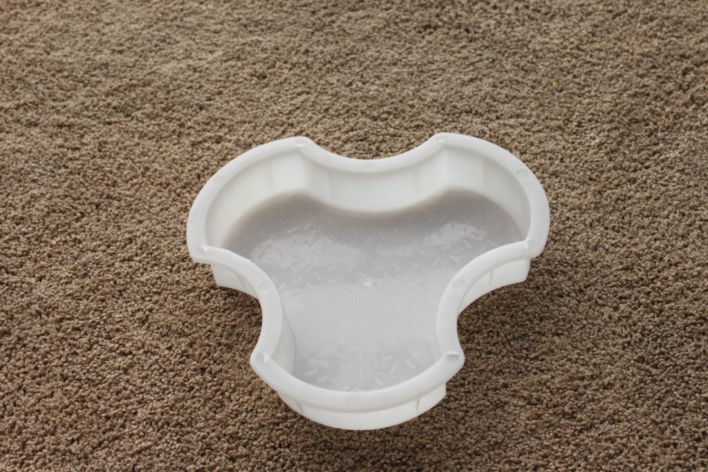 這是一款極具個性化的人行道彩磚模具,采用了較為少見的三葉草形狀設(shè)計。仔細觀察模具底部你可以發(fā)現(xiàn)有很多小橫條不規(guī)則的遍布于整個彩磚模具,這有什么用處呢?很明顯,既然稱之為人行道彩磚模具,那么主要所制水泥彩磚肯定是用于方便行人,類似小橫條在水泥彩磚脫模后可以起到磚面防滑功能,確保人行道路面美觀的同時更加安全。
