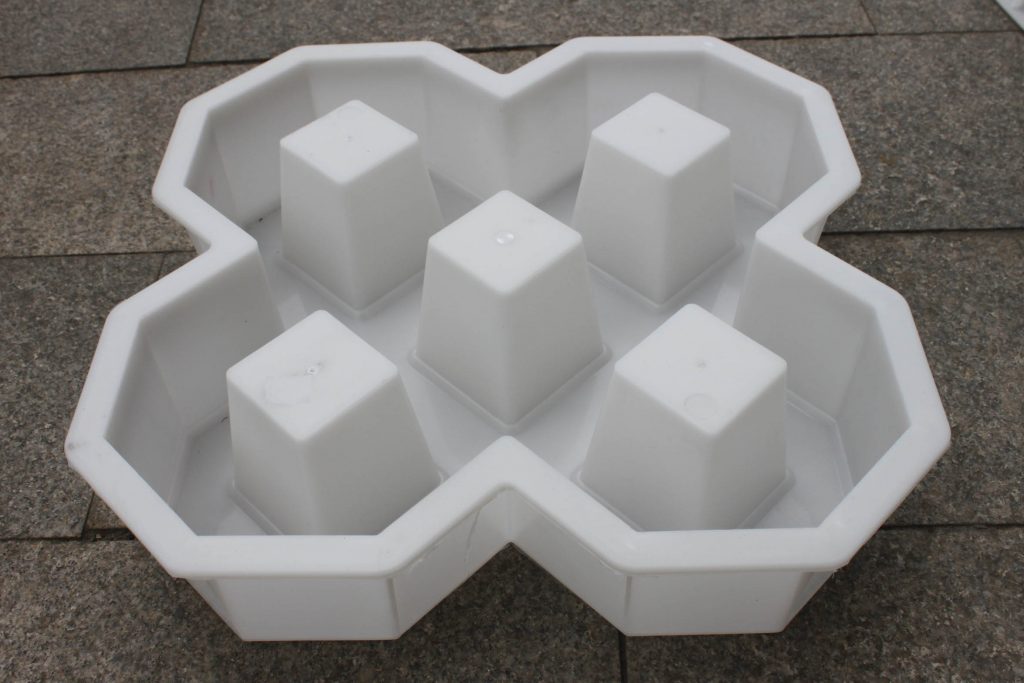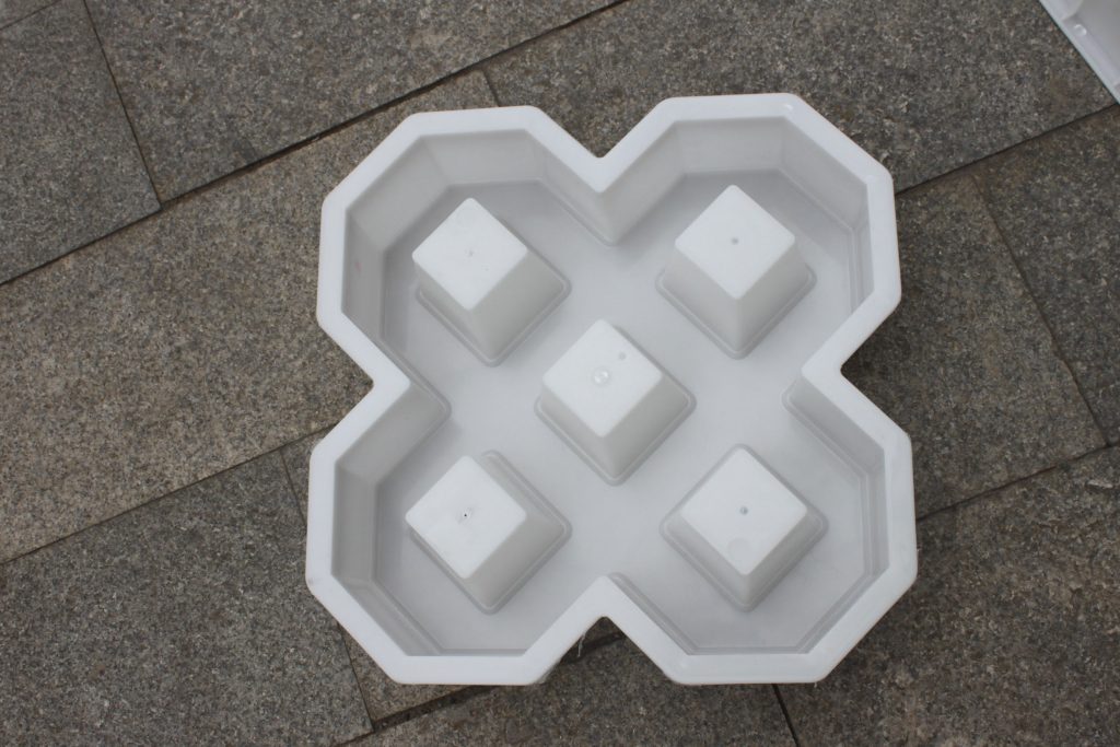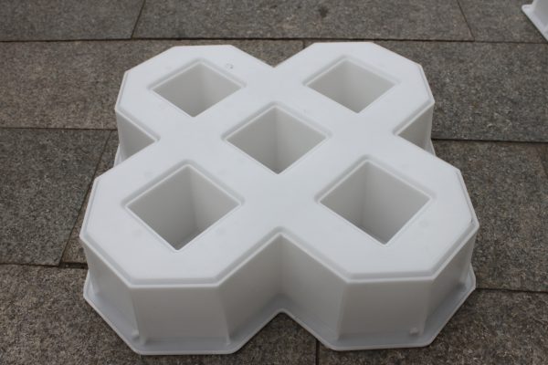 此款路面磚模具主要采用了雙八字五孔植草設計,使用聚丙烯塑料原料注塑加工而成。因其特殊的模具結構設計,可植草空間相比其他植草磚模具大大增多,直觀可見停車場專用路面磚模具所制路面磚單一植草空隙有五處,如果組合拼接鋪設,更可多增加四處,對于大面積停車場的綠色建設工程優(yōu)勢明顯。