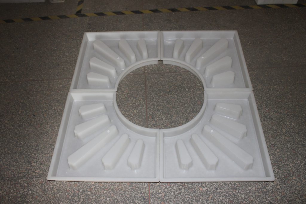 太陽型水泥樹圍模具主要采用了PP聚丙烯塑料為原料,經(jīng)注塑加工完成。主體結(jié)構(gòu)由四塊拼接組成,由于塑料模具表面由類似陽光一樣的線條設(shè)計,遂得名太陽型樹圍模具。不要小看這一條條的線條設(shè)計,除了在美觀結(jié)構(gòu)上有所表現(xiàn),最為關(guān)鍵的是在實際成品的空隙之處方便綠草生長,增強土壤結(jié)構(gòu),對于樹木的保護更為有力。