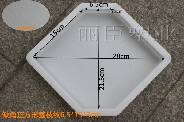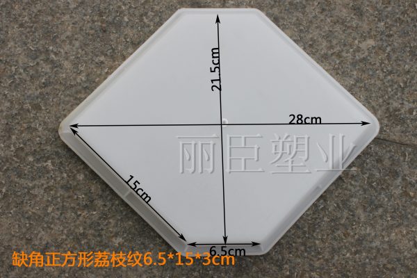 此產(chǎn)品專供西安客戶的一款彩磚模具,主要結(jié)構(gòu)以正方形缺角形狀設(shè)計(jì),其中底部為荔枝紋圖案,即所預(yù)制水泥彩磚成品表面為防滑荔枝紋圖案。此西安彩磚模具對角對稱長度為28CM,缺角對稱長度為21.5CM,詳細(xì)見下圖。
