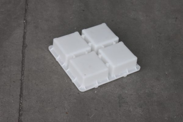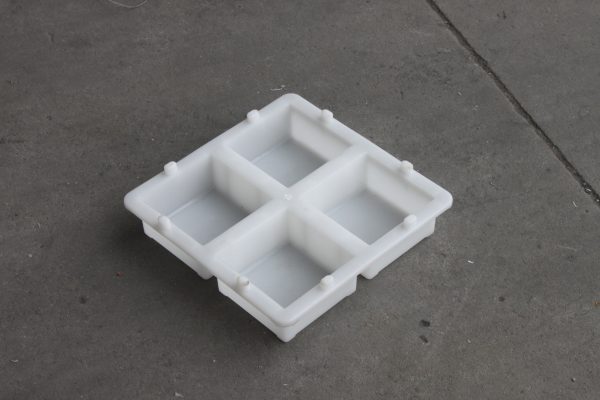 一脫四整體結(jié)構(gòu)的水泥磚模具,全新聚丙烯塑料材質(zhì),采用臥式注塑機(jī)半固定式注塑模具,單型腔熱流注塑成型。水泥磚塑料模具整體尺寸為22*22CM正方形結(jié)構(gòu)設(shè)計(jì),共分為4個(gè)10*10*5的水泥磚脫模空間。