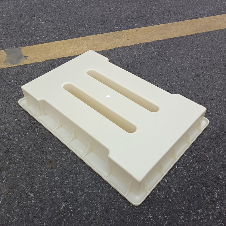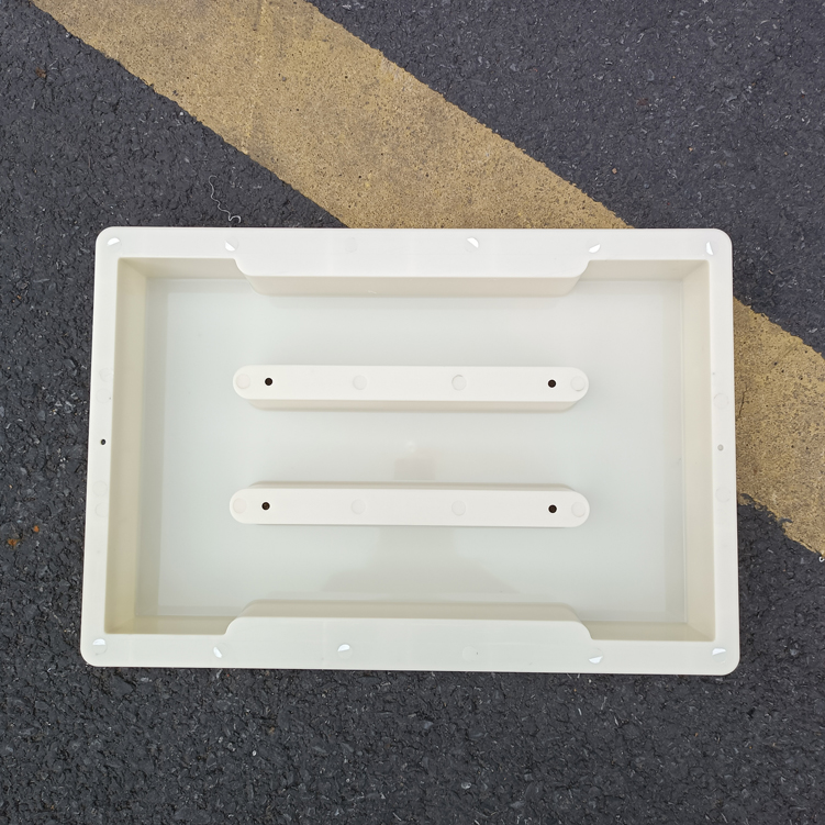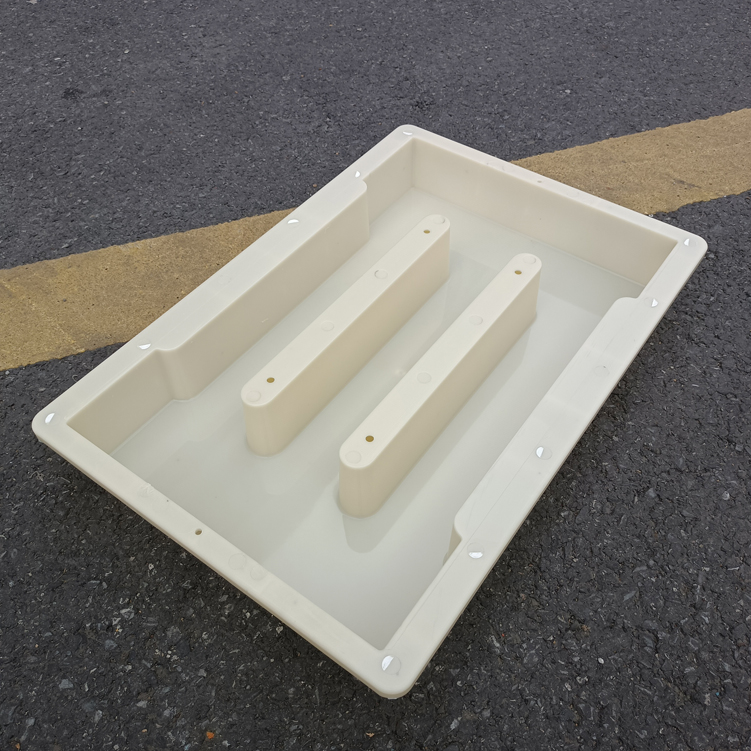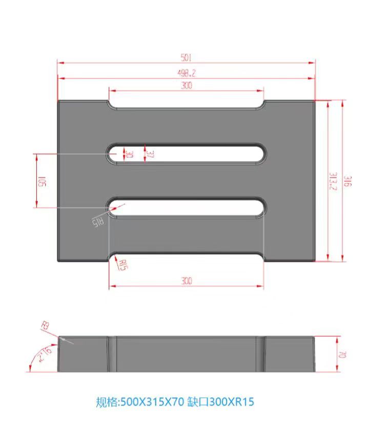 模具整體材質(zhì)采用強度較高的淺黃色ABS材質(zhì)制成、模具帶缺口二孔,大體尺寸為50cm*31.5cm*7cm,具體尺寸如下設(shè)計圖,模具材質(zhì)強度高,可以重復(fù)使用多次,擁有缺口的設(shè)計可以使雨水流通量更大,更不容易造成堵塞。