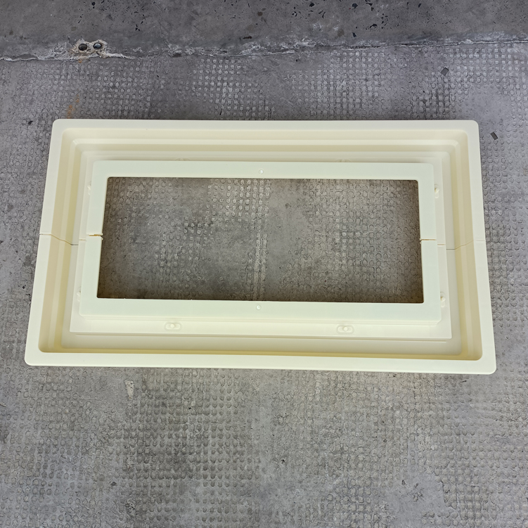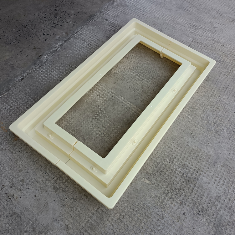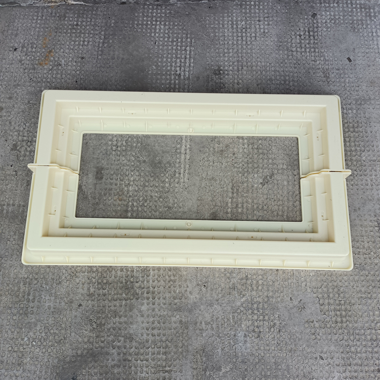 方井座塑料模具,模具采用拼接方式、為兩個(gè)組裝而成、寬度可以增加調(diào)節(jié),有設(shè)配件井座B,該長度、寬度尺寸為模具尺寸最外邊、包括翻邊。