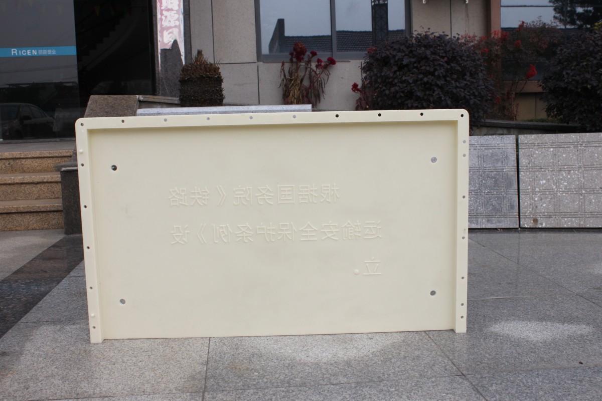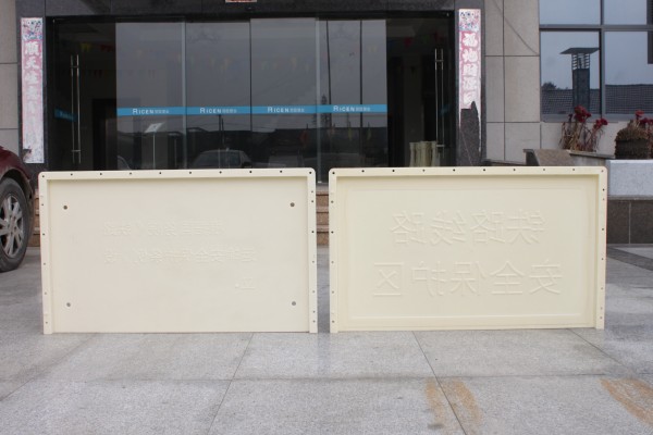 標(biāo)識牌塑料模具主要的結(jié)構(gòu)為2快拼合而成。標(biāo)識牌總共分為2個部分:一面印有“國家鐵路安全線路保護(hù)區(qū)”字樣,另一面為“根據(jù)國務(wù)院《鐵路安全運(yùn)輸保護(hù)條例》設(shè)立”字樣。此水泥警示牌模具為國家中鐵局定制,任何企業(yè)及個人制造都需國家鐵路局授權(quán)許可才可制造生產(chǎn)。
